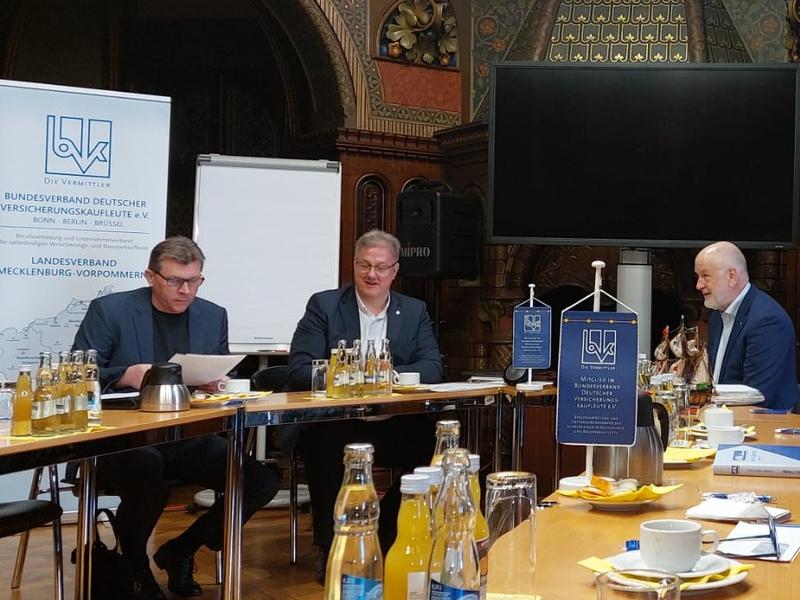 v.l.n.r. auf der Terrasse der IHK zu RostockChristoph Klug - Klug Beraten als Referent,   René Ohnesorg - Vorsitzender des Bezirksverbandes Rostock,   Melanie Wicht - Hauptgeschäftsführerin der IHK zu Rostock,   Jörg Rackow - Vorsitzender des Landesverbandes Mecklenburg- Vorpommern,   Jana Zirzow -  Referentin Vermittlergewerbe bei der IHK,   Olaf Heilig - Vorsitzender des Bezirksverbandes Schwerin (Versammlungsleiter),  Michael H. Heinz - Präsident des Bundesverbandes Deutscher Versicherungskaufleute e.V. Bonn